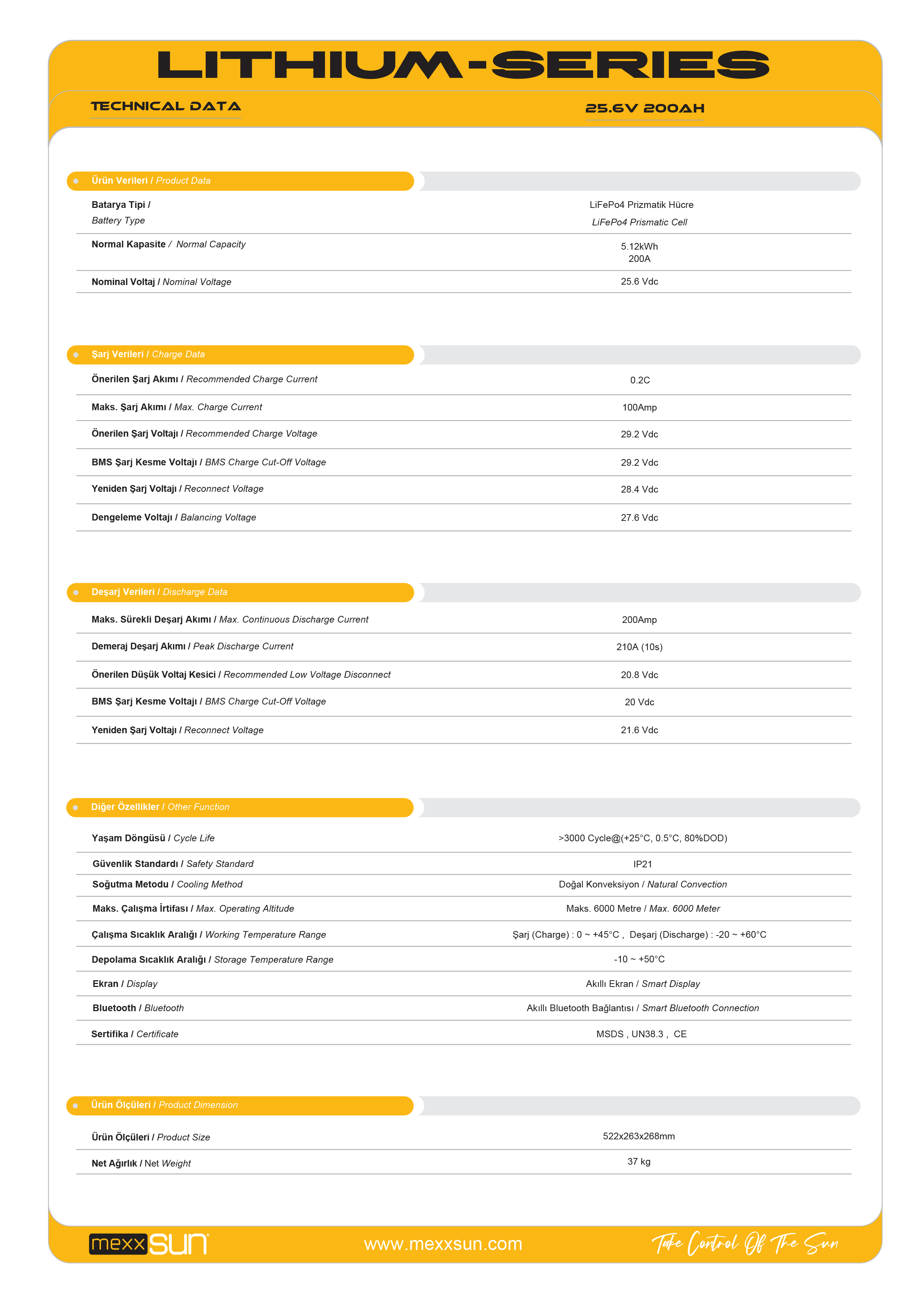 MEXXSUN Lityum Akü 25,6V 200Ah (LiFePo4) 5120Wh